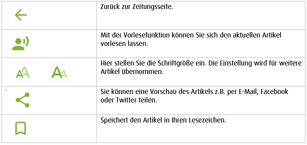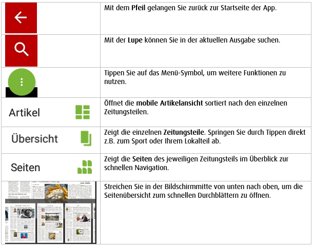 In der Titelleiste wird Ihnen beim Start das tagesaktuelle Exemplar Ihrer Lokalausgabe angezeigt. Durch Tippen starten Sie den Download im Hintergrund und können sofort lesen. Durch Tippen auf die Vorschauseiten darunter steigen Sie sofort im entsprechenden Zeitungsteil (z.B. Sport, Lokales) ein.