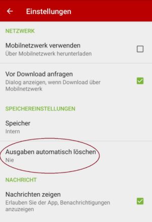 Zu Beginn ist die App so eingestellt, dass heruntergeladene Ausgaben nicht automatisch gelöscht werden. Sie können aber jederzeit unter „Einstellungen“ festlegen, nach wie vielen Tagen die App eine Ausgabe automatisch löschen soll.