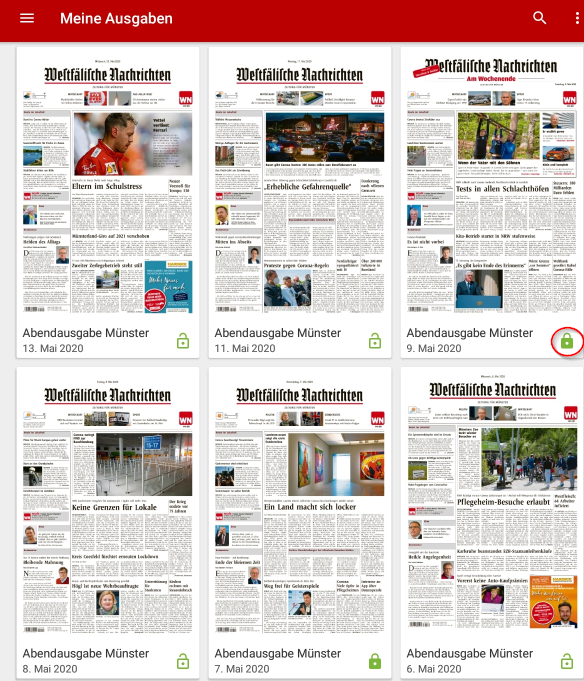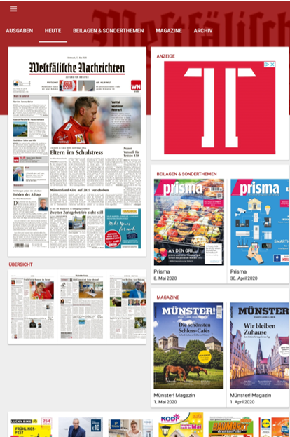 Weiterhin sehen Sie von der Redaktion ausgewählte Artikel aus der aktuellen Ausgabe. Durch Tippen öffnen Sie die mobile Artikelübersicht (optimiert für das Lesen auf dem Tablet/Smartphone). Aktuelle Nachrichten werden Ihnen als Service der Online-Redaktion ebenfalls (mit dem Zusatz „Newsticker“) in diesem Abschnitt angezeigt und mehrmals täglich aktualisiert. Durch Antippen der Vorschau gelangen Sie auf das Nachrichtenportal www.wn.de. Artikel, die Sie bereits gelesen haben, werden in der Übersicht blasser dargestellt, damit Sie immer den Überblick behalten